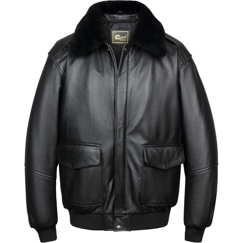 REED EST. 1950 Men’s Luxury Aviator Bomber Jacket – Genuine Leather, Durable Craftsmanship, Timeless Design(Black Fur Collar)