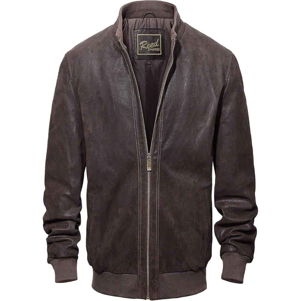 REED EST. 1950 Men’s Coat Genuine Lambskin Leather Stand UP Collar S5Z Bomber Jacket(Brown)