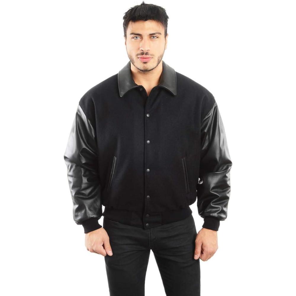 REED EST. 1950 Men’s Premium Varsity Jacket – Made in USA Wool Body with Leather Sleeves, Relaxed Fit, Quilted Lining(Black – Leather Collar)